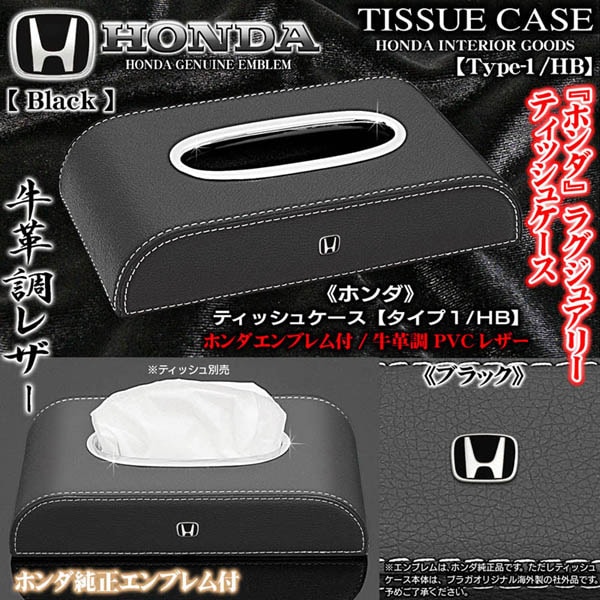 《ホンダ純正ブラックエンブレム付》ティッシュケース【タイプ1/HB】ブラック/牛革調PVCレザー/メッキリム/欧米仕様/客注品/ブ...