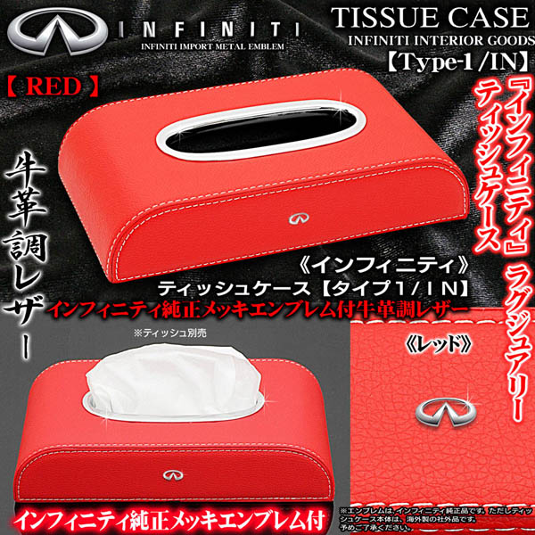 タイプ1/IN《日産/インフィニティ》レッド/ティッシュケース/牛革調PVCレザー/インフィニティ純正エンブレム付/欧米仕様客注品...