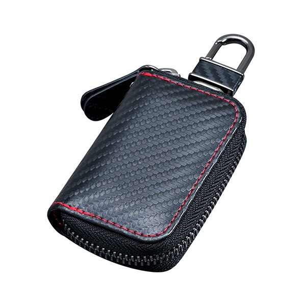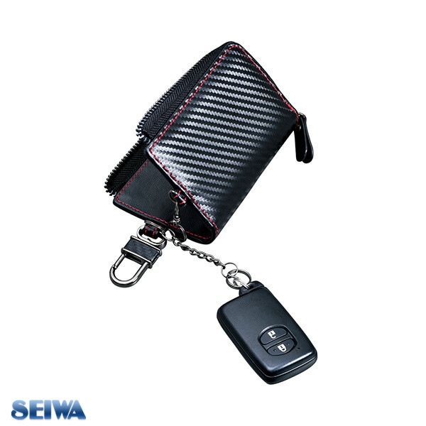 セイワ カーボン スマートキーケース 鍵入れ ブラック コンパクト ミニポケット付 カラビナフック 落下防止 WA11