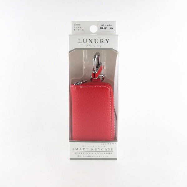 プラウド スマートキーケース レザー調 レッド 鍵入れ カラビナ チェーン付 小物入れ 便利 収納 ワンタッチ DI-517