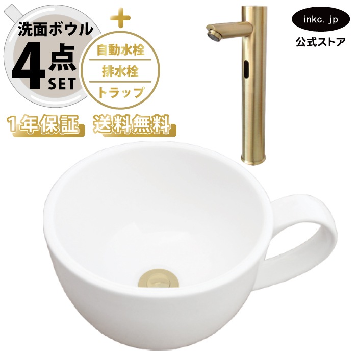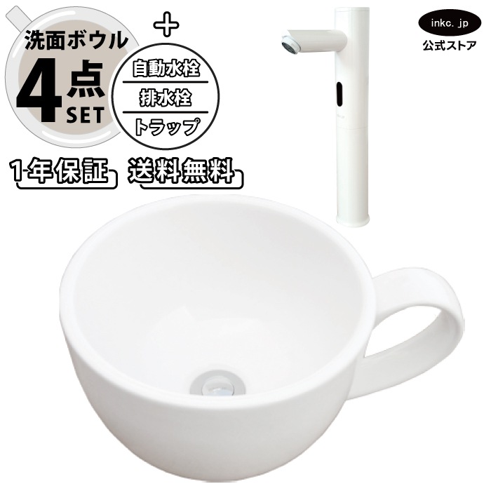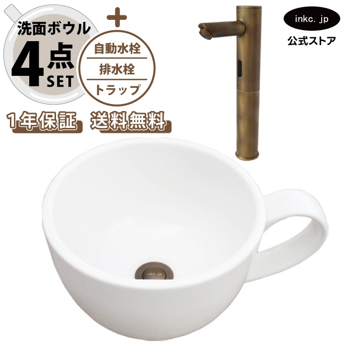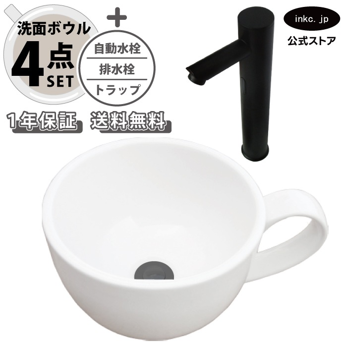 4点セット 洗面ボウル+自動水栓+排水栓+排水トラップ 陶器 コーヒーカップ 手洗い器 手洗い鉢 小さい 置き型 オーバーフロー無...