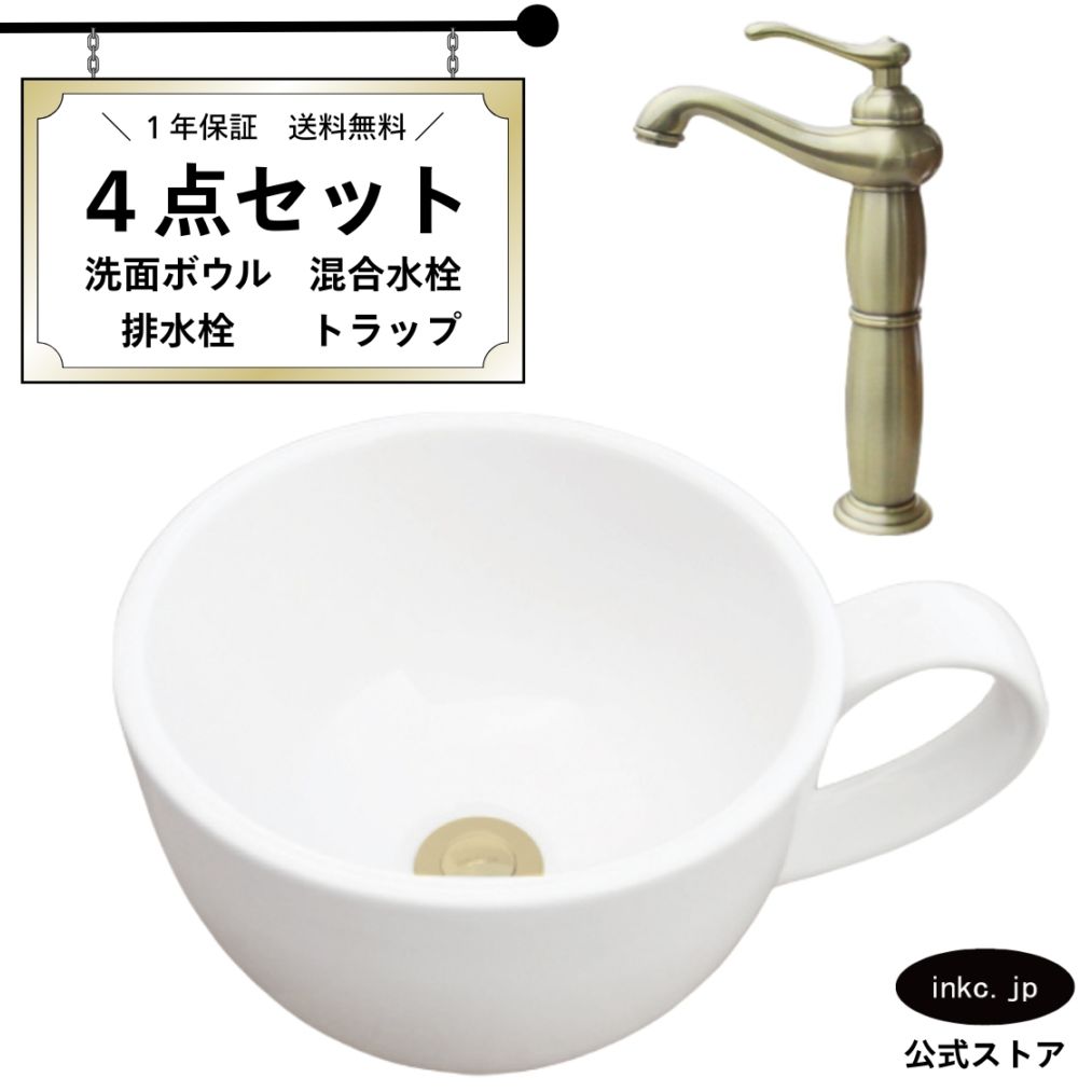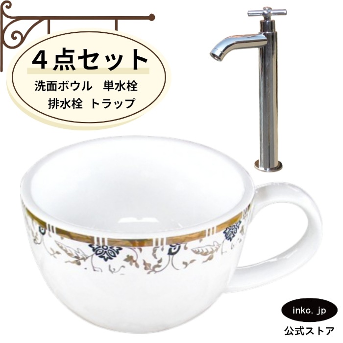 4点セット 洗面ボウル+単水栓+排水栓+排水トラップ 陶器 コーヒーカップ 手洗い器 手洗い鉢 小さい 置き型 金花柄 模様 オー...