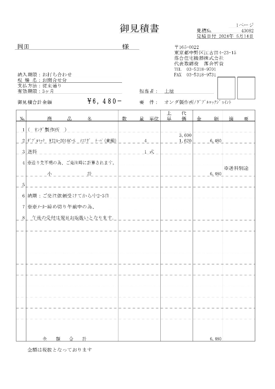 【専用ページ】見積NO:43082 ダブルロック WJ2A-2016C-S メスアダ テーパ(青銅)【ネコポス不可】