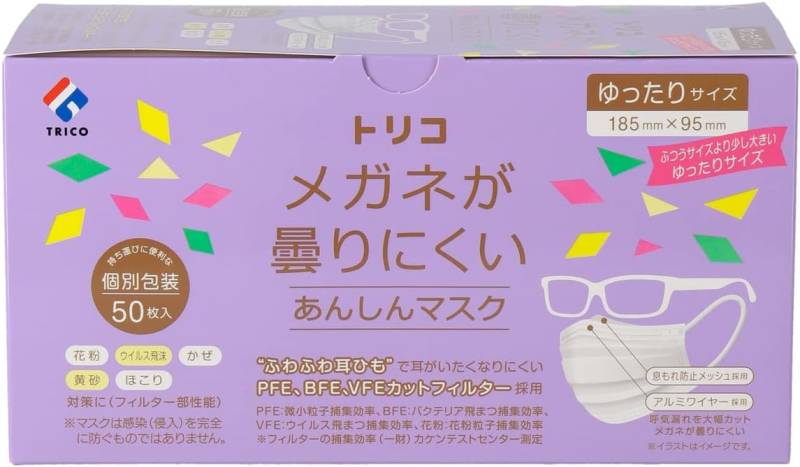 不織布 マスク trico トリコ メガネが曇りにくいあんしんマスク 個包装 ゆったり 50枚 大きいサイズ 大きめ