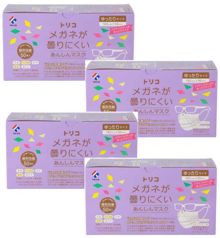 不織布 マスク trico トリコ メガネが曇りにくいあんしんマスク 個包装 ゆったり 50枚×4【4個セット】送料無料 大きいサ...