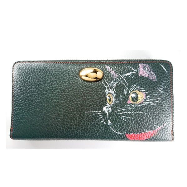 手描き猫 『ハッとする可愛さ』 ラウンド長財布 日本製 黒×朱色 A