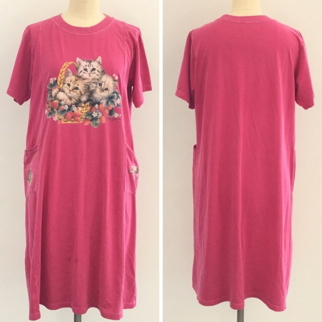 国内古着 猫 苺 半袖ワンピース ビッグTシャツ レディース S-M/ピンク ルームウェア リラックス ドレス 古着卸 送料無料