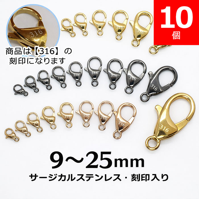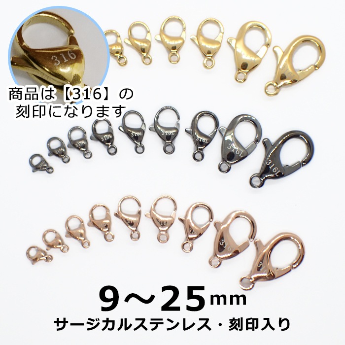 【316 刻印入り】 サージカルステンレス製 カニカン 9-25mm ゴールド・ピンクゴールド・ガンメタ【1個】 アレルギーフリー...