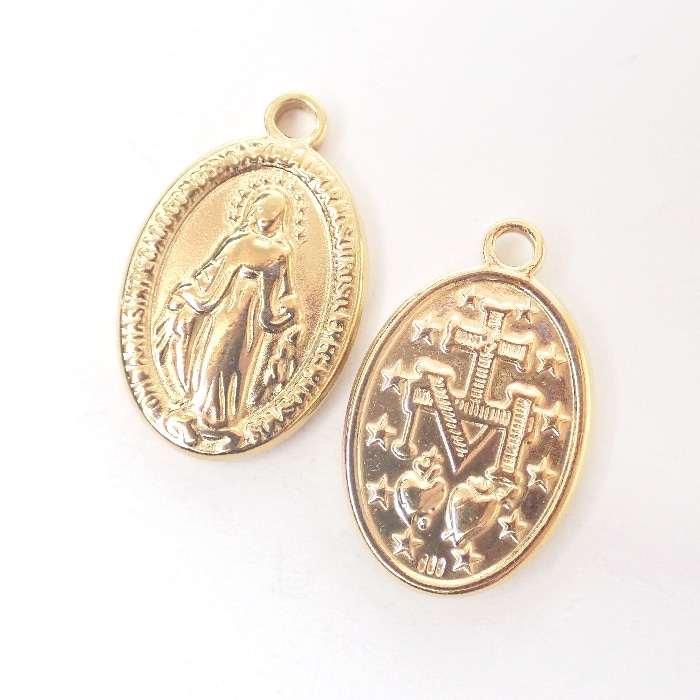 【SUS304】ステンレス製 メダイ チャーム 金色 約24mm×15mm 聖母マリア パーツ 金属アレルギー対応