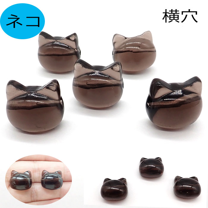 天然石 ネコ ビーズ(1個)横穴 【スモーキークォーツ 】ブラウン グレー 猫 顔 パワーストーン 国内発送