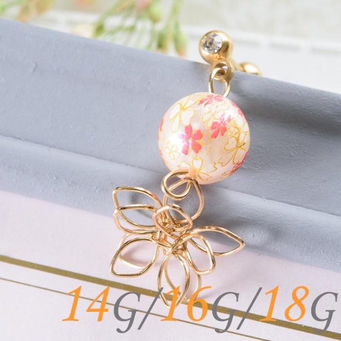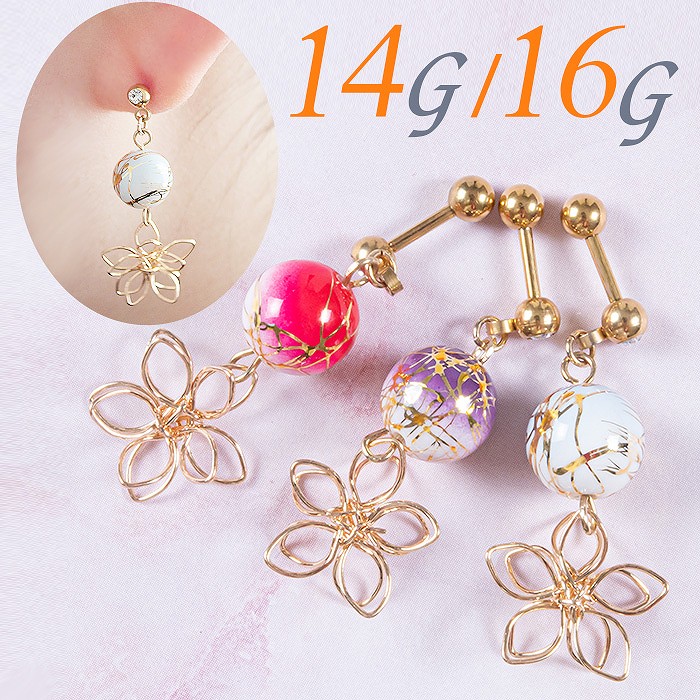 ロング ジュエル ボール 16G 14G ボディピアス 花 ビジュー ストレートバーベル 和風 和もの 和装 和服 浴衣 トラガス...