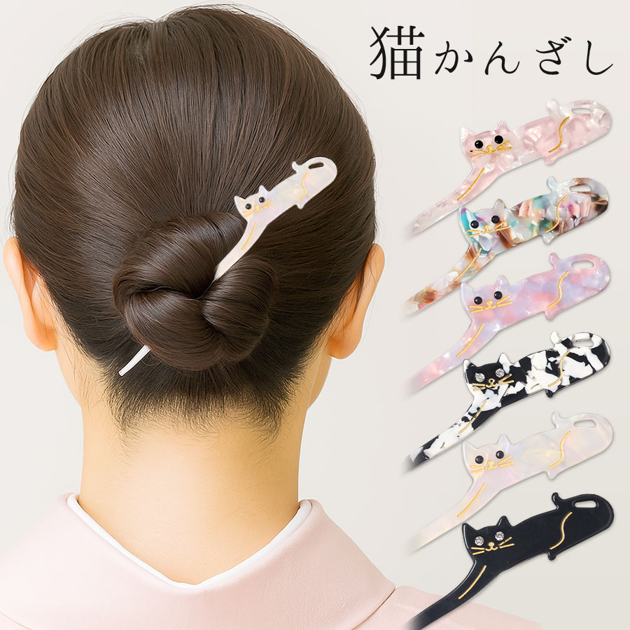 猫 かんざし 一本 一本挿し 普段使い ネコ ねこ マーブル模様 一本足 まとめ髪 お団子 和装 着物 【送料pt100】