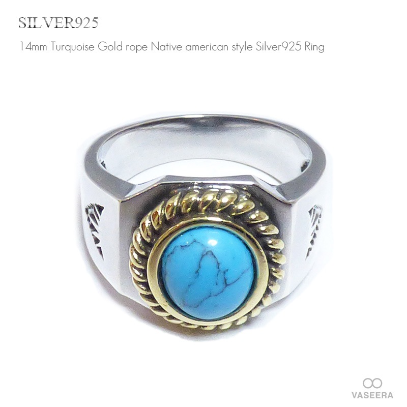 ターコイズ ネイティブ ゴールドロープ 14mm幅 シルバーリング 【シルバー925/SILVER925 /指輪/インディアンジ...