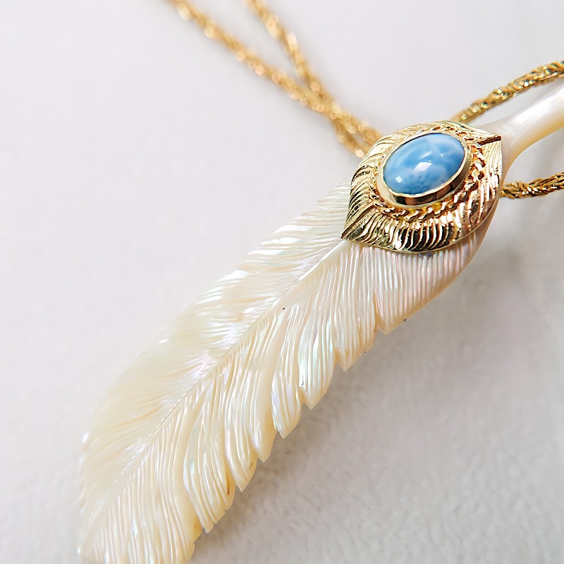一点物 夜光貝のフェザーネックレス 高品質ラリマールースbrassTOP +