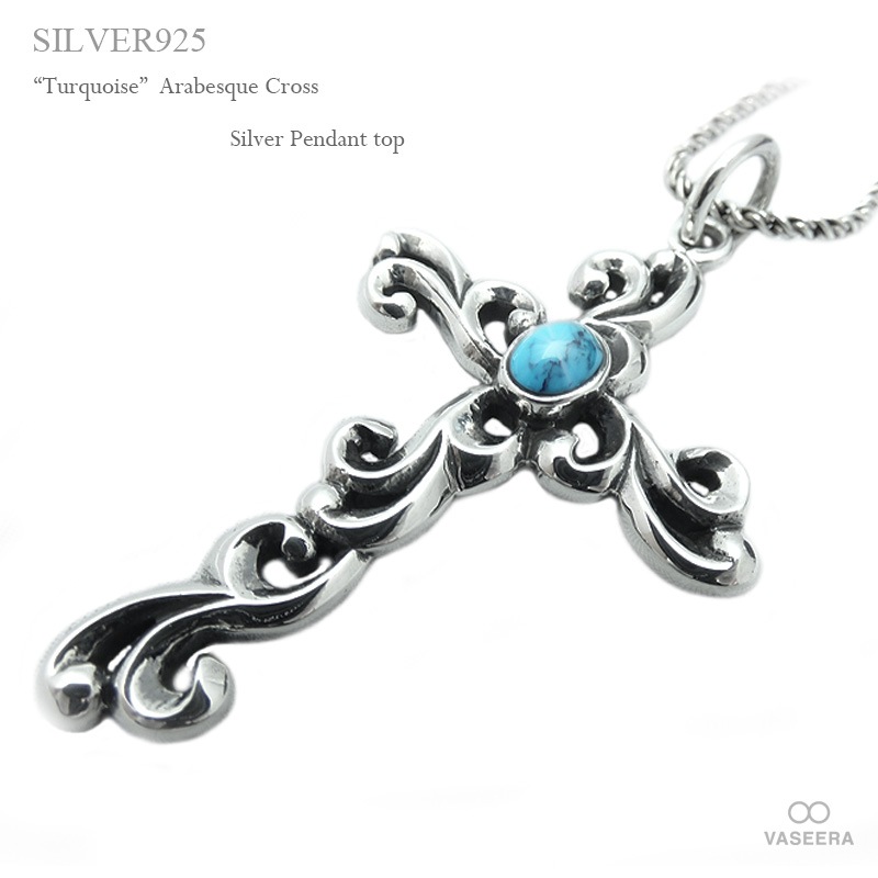 ターコイズ埋め込み 全長60mm 透かし彫りアラベスク(唐草) クロス シルバー ペンダント トップ 【シルバー925/SILVE...