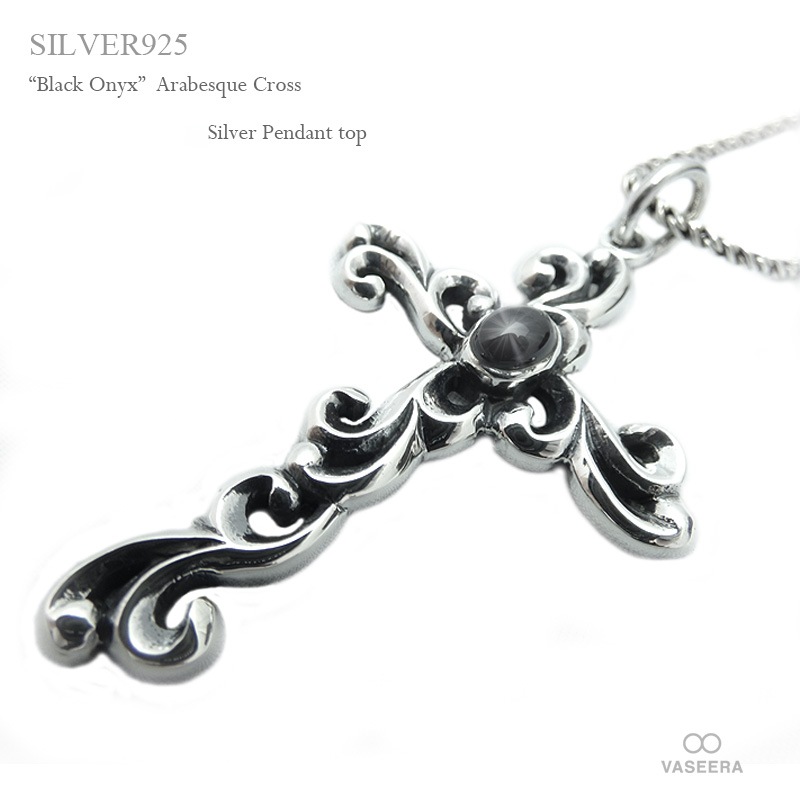 オニキス埋め込み 全長60mm 透かし彫りアラベスク(唐草) クロス シルバー ペンダント トップ 【シルバー925/SILVER...