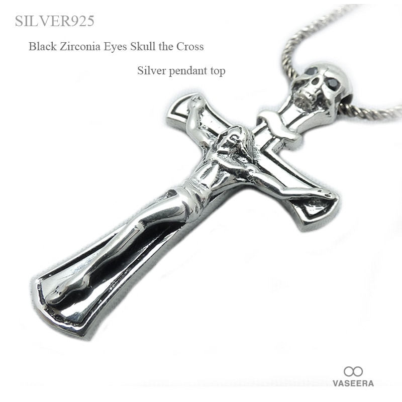 48mm キリストクロス 両眼ブラックジルコニア埋め込みスカルバチカン シルバー ペンダント トップ 【シルバー925/SILVE...