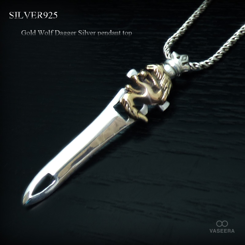 ゴールドコーティング・ウルフ(金狼) ダガースタイル(短剣型) シルバー ペンダント トップ 【シルバー925/SILVER925...