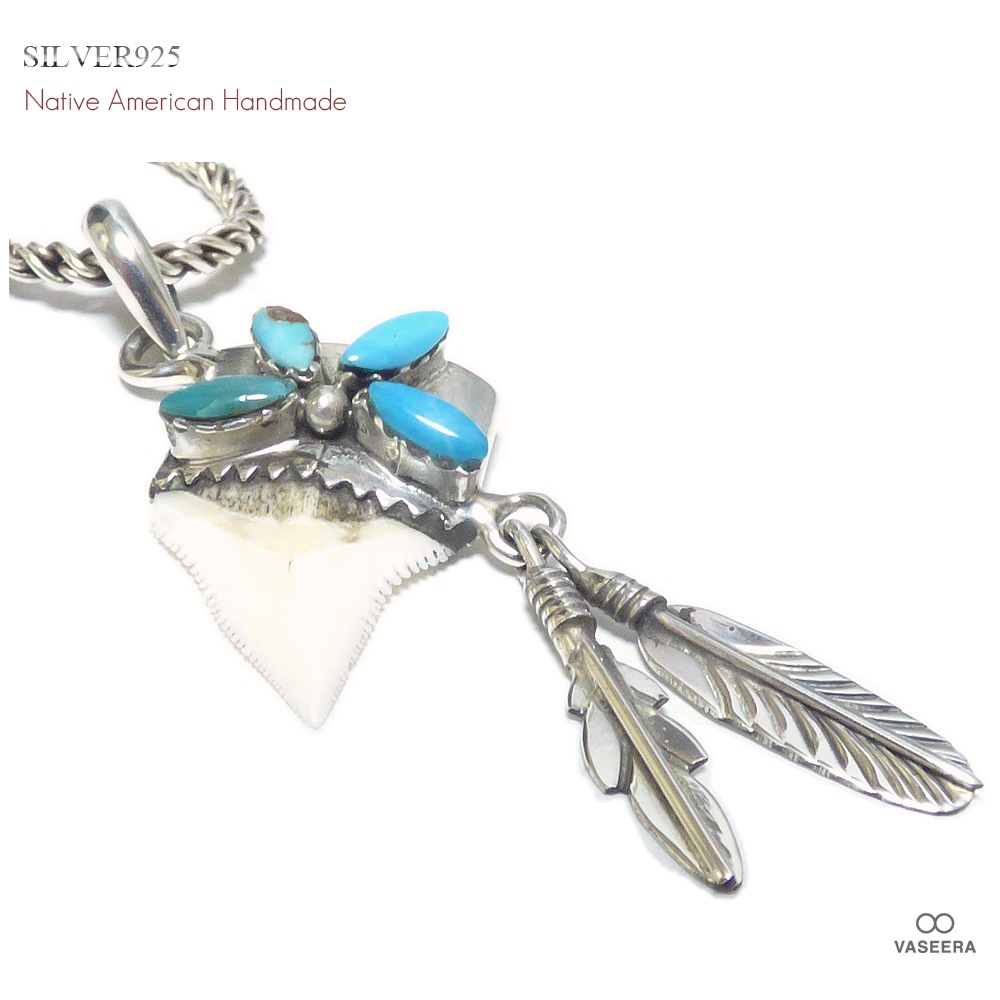 ネイティブアメリカン ハンドメイド ホオジロサメの牙&フェザー シルバー925 ペンダント トップ 【インディアンジュエリー】