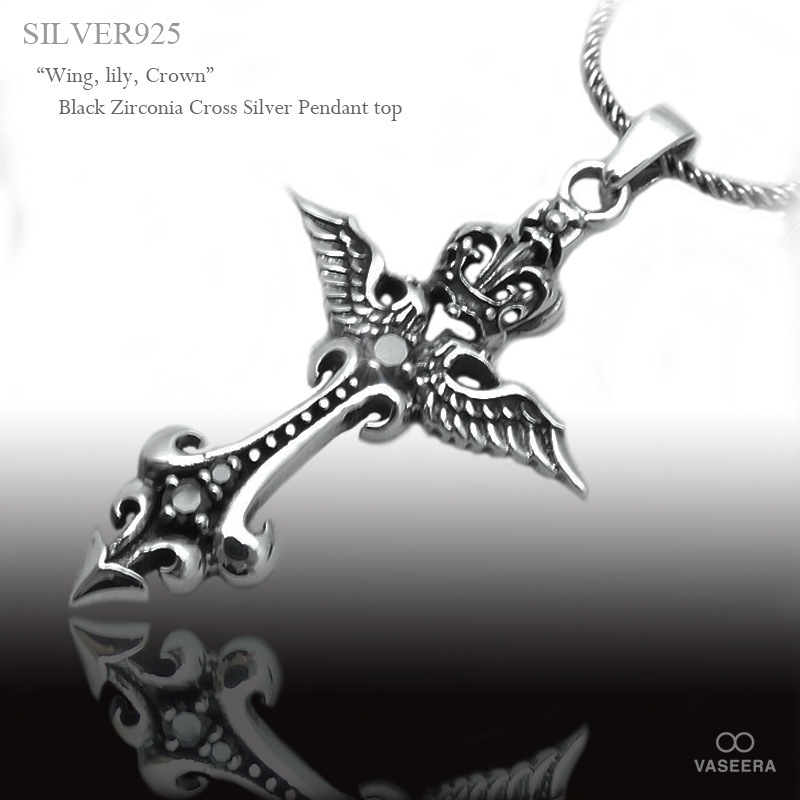 ブラックジルコニア埋め込み クラウン ウイング リリー (王冠/翼/ユリ紋章) クロス シルバー ペンダント トップ 【シルバー...
