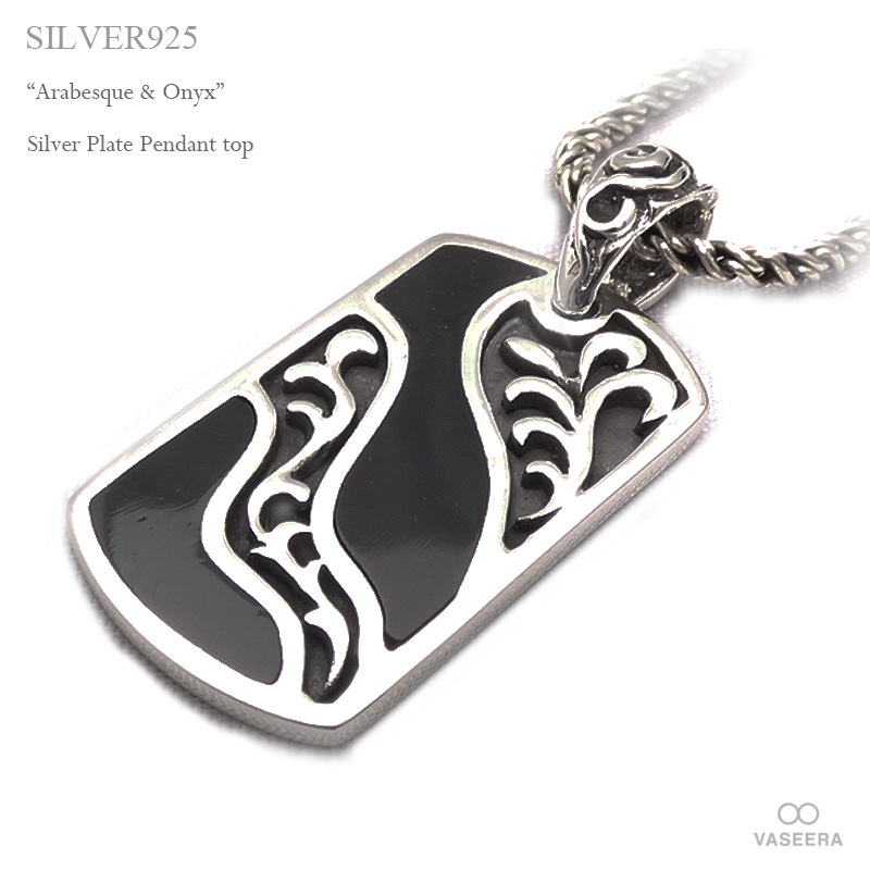 ブラックオニキス埋め込み アラベスク(唐草)デザイン プレート シルバー ペンダント トップ 【シルバー925/SILVER925...