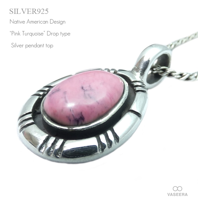 ネイティブ系 37mmドロップ型 ピンクターコイズ埋め込み シルバー ペンダント トップ 【シルバー925/SILVER925 /...