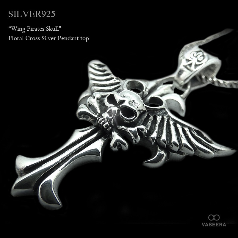 ウィング パイレーツ スカル/ドクロ シルバー クロス ペンダント トップ 【シルバー925/SILVER925 /ペンダントヘッ...