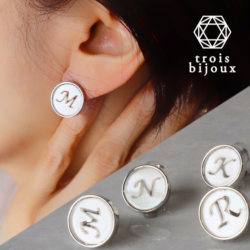 イニシャルイヤリング 白蝶貝【 シェル×シルバー】メダル 痛くならないシリコン樹脂