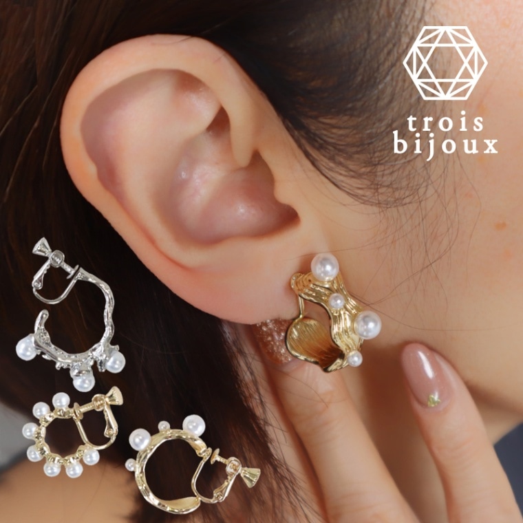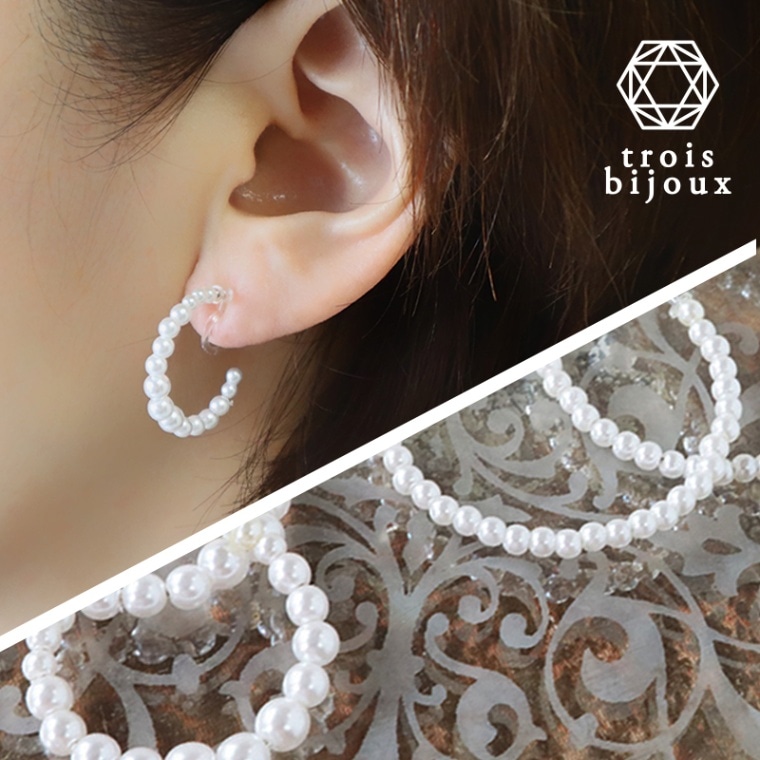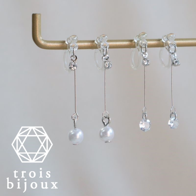 イヤリング シリコンノンホール ワイヤークリアストーン/パール