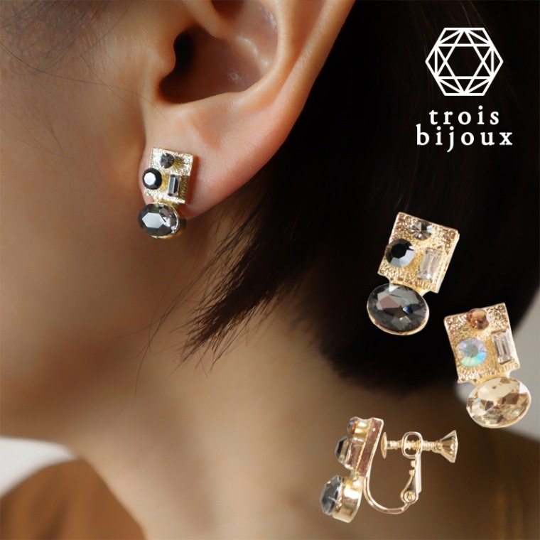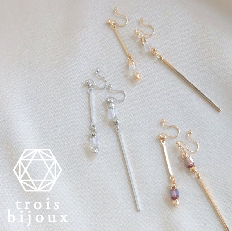 ノンホールイヤリング スティックガラスキューブ アシンメトリー
