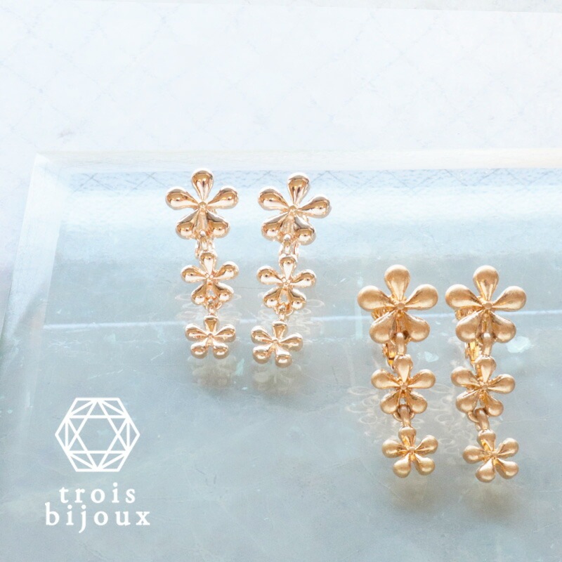 フラワー三連イヤリング 揺れるロング グラデーション ぶら下がり