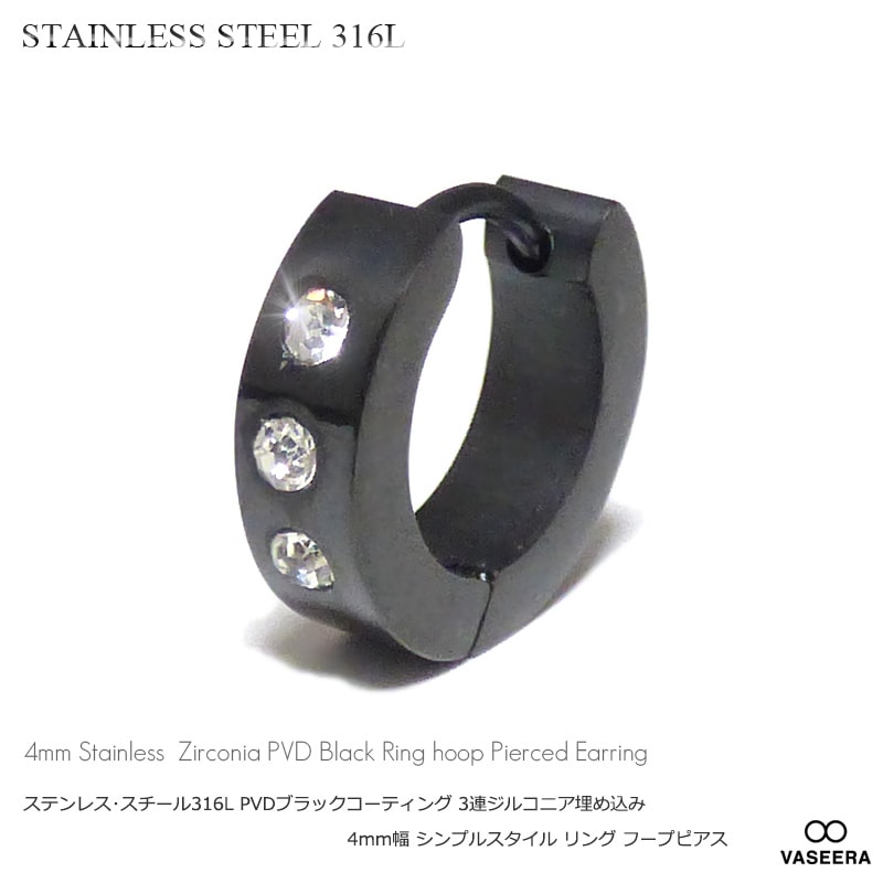 【単品販売(一個)】 4mm幅 PVDブラックコーティング仕上げ 3連ジルコニア埋め込み リング フープピアス 【ステンレスピアス...