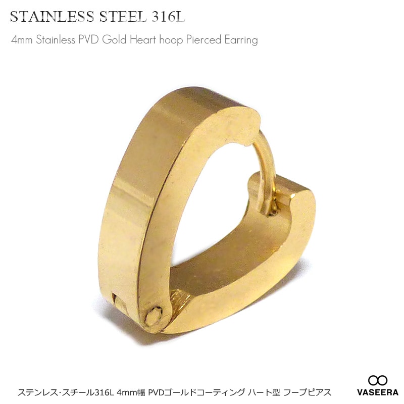 【単品販売(一個)】 4mm幅 PVDゴールドコーティング ハート型 フープピアス 【ステンレスピアス/サージカルステンレス/S....