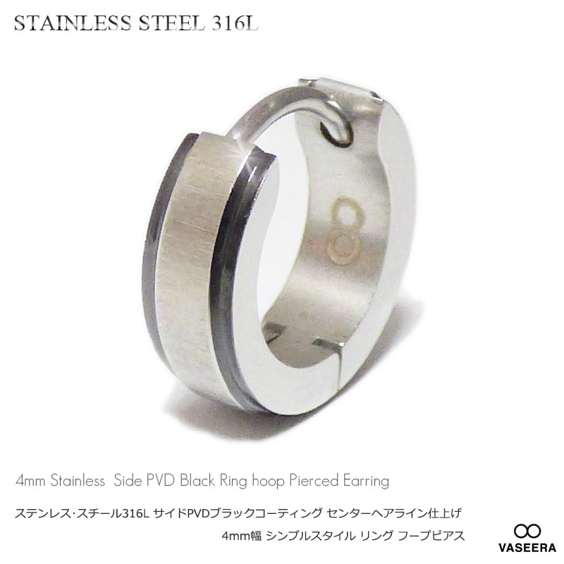 【単品販売(一個)】 4mm幅 センターヘアライン サイドPVDブラックコーティング リング フープピアス 【ステンレスピアス/...