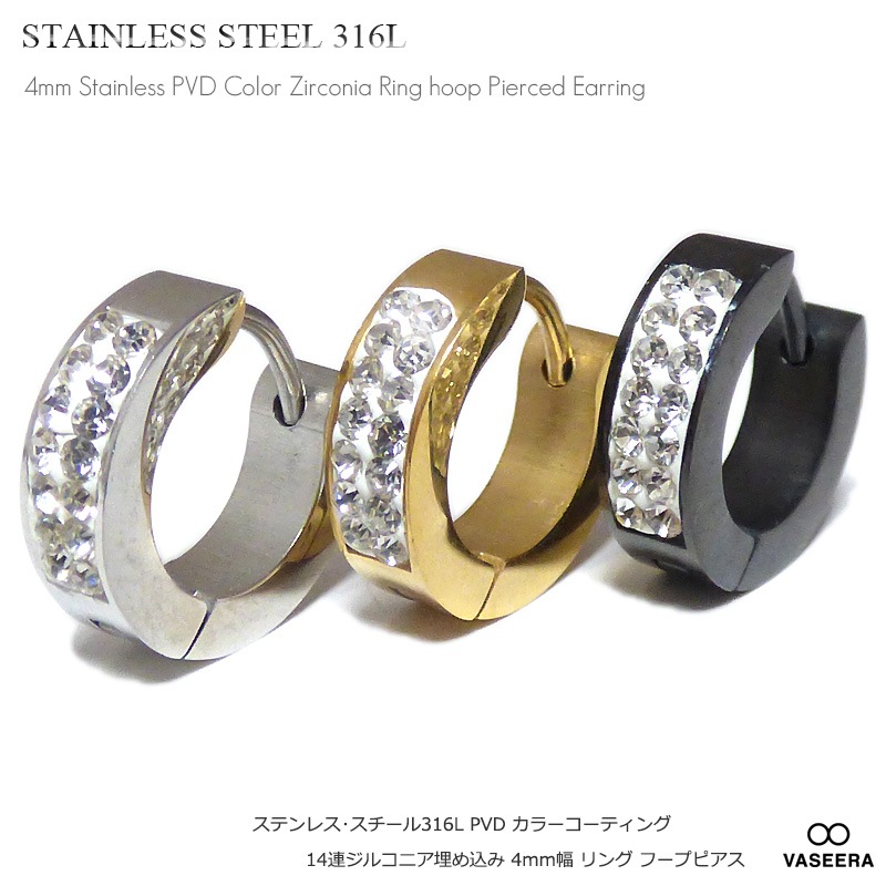 【単品販売(一個)】 4mm幅 14連ジルコニア埋め込み PVDカラーコーティング(シルバー/ゴールド/ブラック) リング フープ...