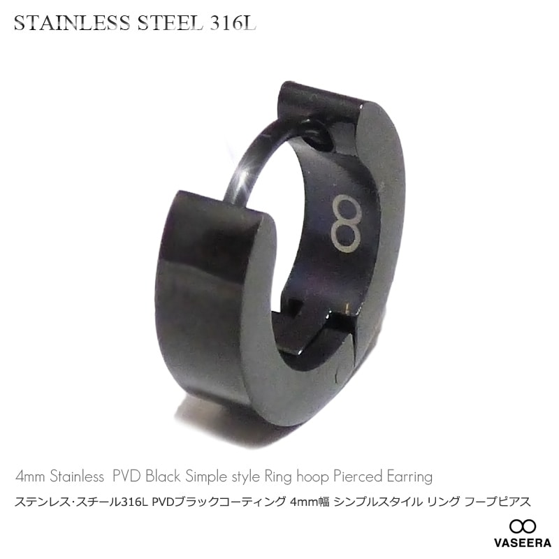 【単品販売(一個)】 4mm幅 シンプルスタイル PVDブラックコーティング リング フープピアス 【ステンレスピアス/サージカル...