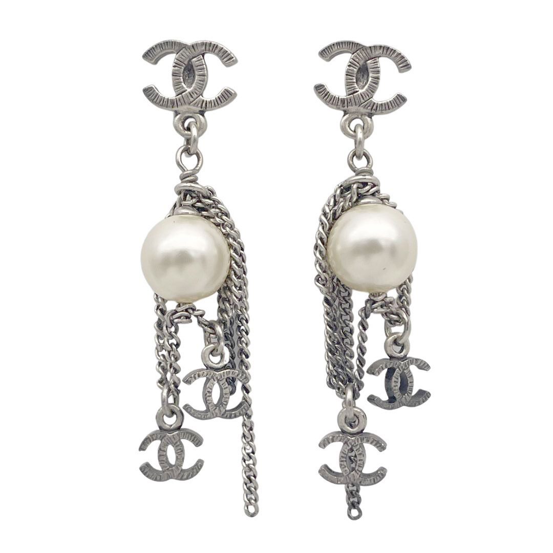 CHANEL シャネル ピアス トリプルココマーク チェーン フェイクパール 09A シルバー