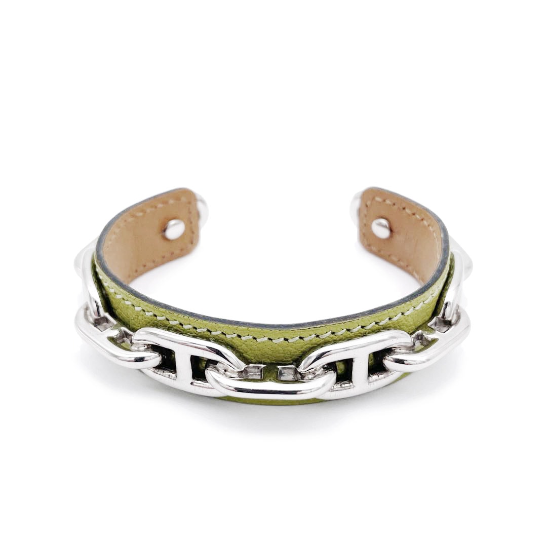 HERMES エルメス シェーヌダンクル レザー バングル ブレスレット シルバー ライトグリーン □F刻印