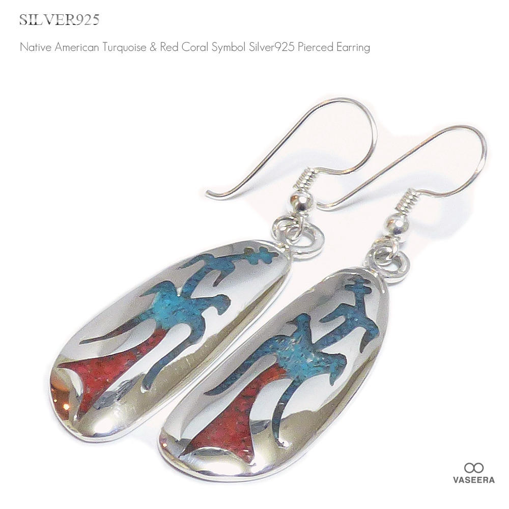 ネイティブアメリカン ハンドメイド ターコイズ&赤珊瑚 インレイ仕上げ トライバルシンボル シルバー925 ジプシーピアス(フック...