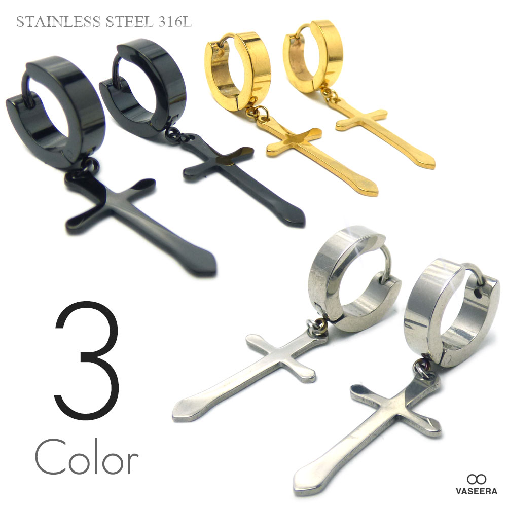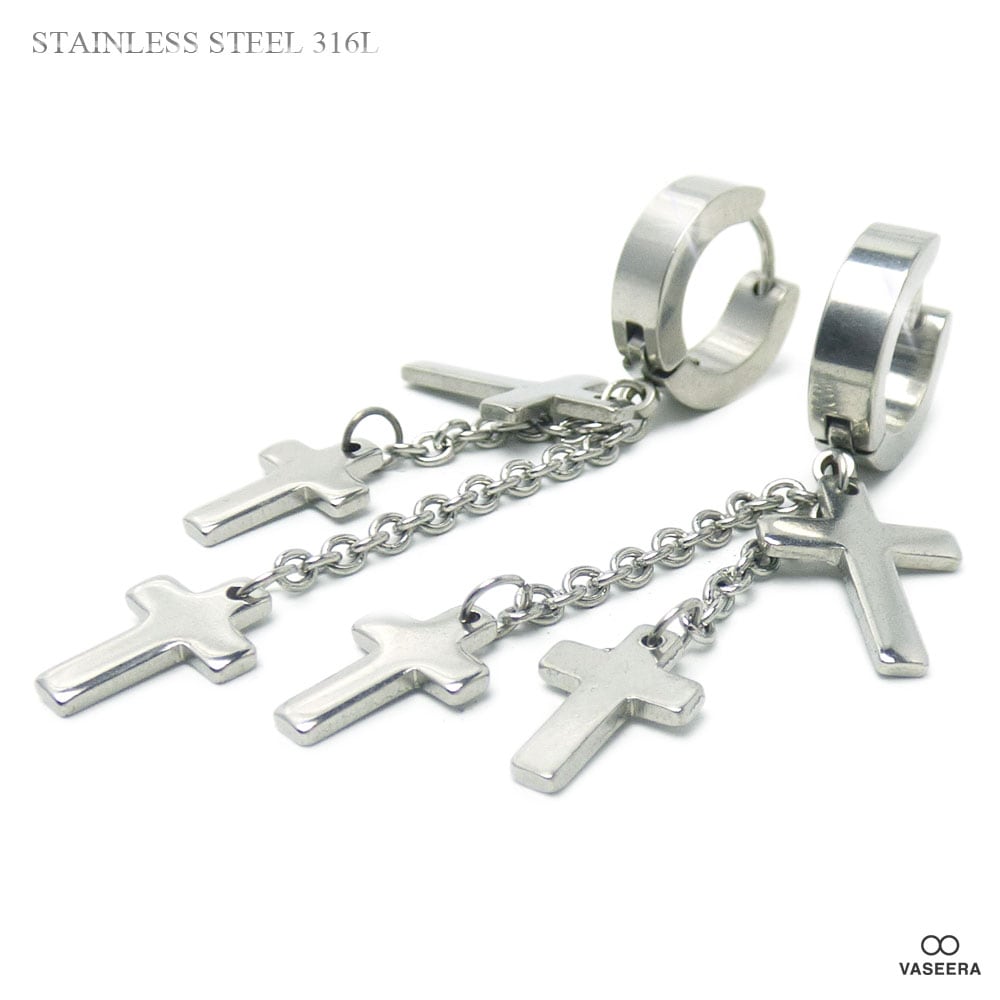 【2個セット(両耳用)】 3連クロスチャーム 4mm幅リング フープ 56mmチェーンピアス 【ステンレス・スチール316L】