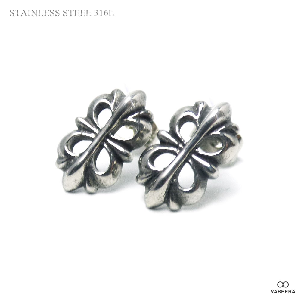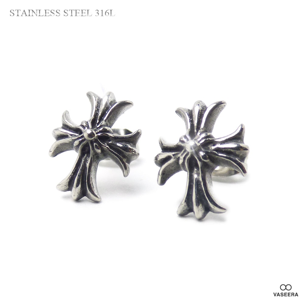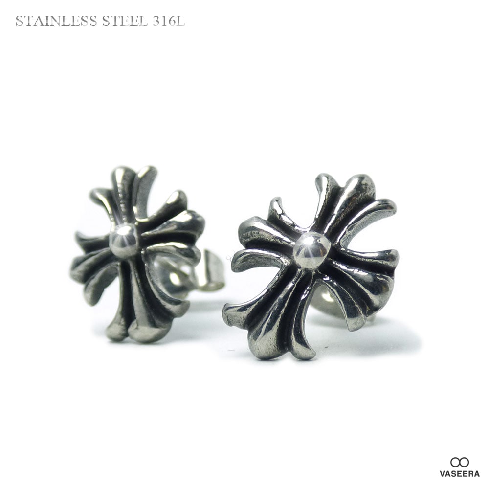 【2個セット(両耳用)】 15mm透かし彫りフローラルクロス ブラックポリッシュ アンティーク仕上げ ステンレス ピアス 【ステン...