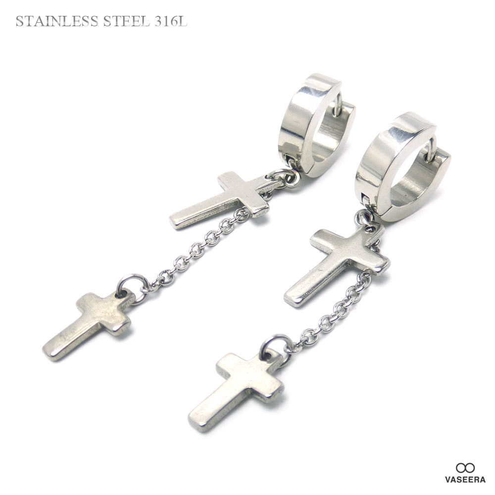 【2個セット(両耳用)】 2連クロスチャーム 4mm幅リング フープ 56mmチェーンピアス 【ステンレス・スチール316L】