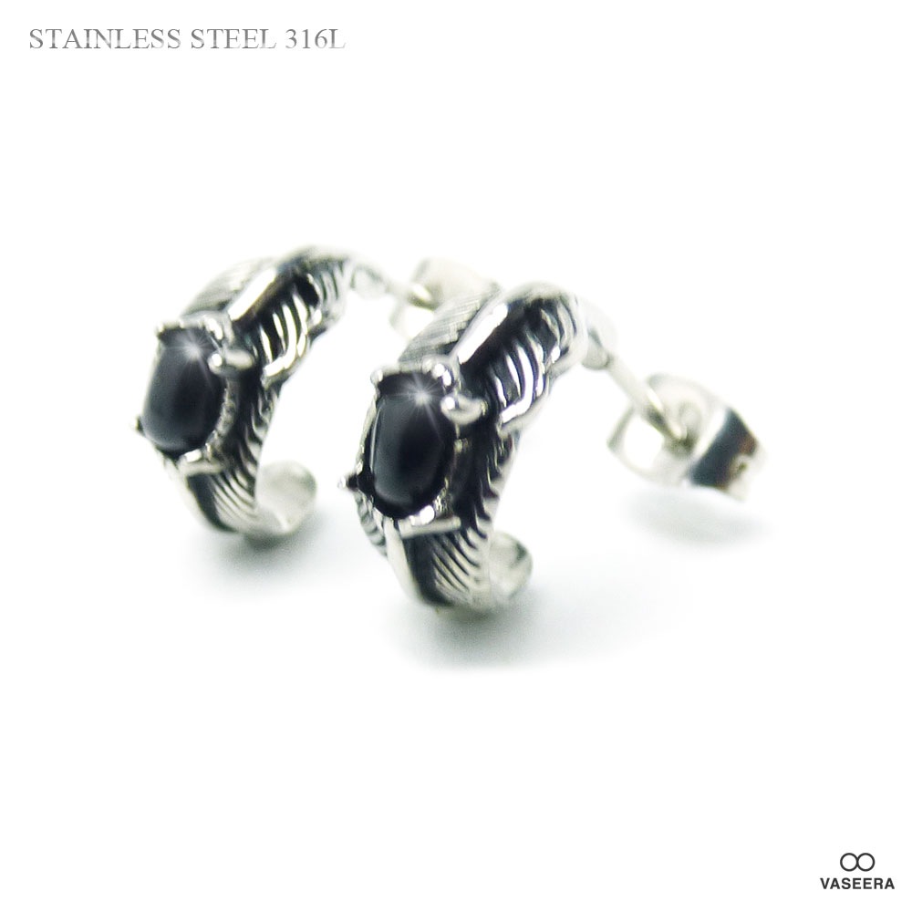 【2個セット(両耳用)】 ブラックジルコン埋込み フェザー(羽根) ブラックポリッシュ アンティーク仕上げ ステンレスピアス 【ス...