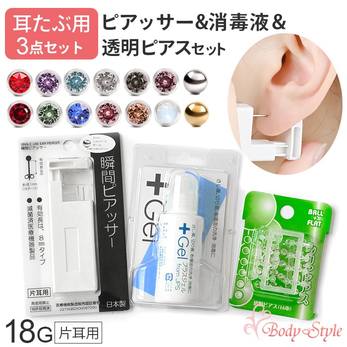 【片耳用ピアッサー&消毒ジェル&透明ピアス】ピアッサー 3点セット 耳たぶ用 18G 片耳用 金属アレルギー対応 日本製 医療用ス...