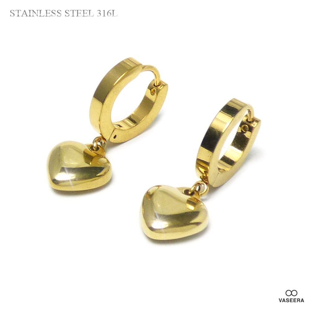 【2個セット(両耳用)】 PVDゴールド パフハートチャーム 細身 3mm幅リング フープピアス 【ステンレス・スチール316L】