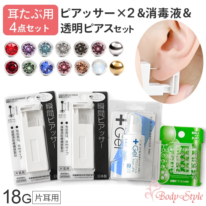 【片耳用ピアッサー2個&消毒ジェル&透明ピアス】ピアッサー 耳たぶ用 18G 4点セット 片耳用 両耳用 金属アレルギー対応 日本...