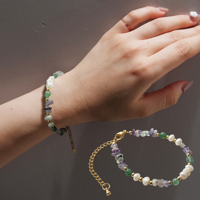 ストーンブレスレット フローライト 淡水パール 内周約16.5cm SUS316 サージカルステンレス 750279