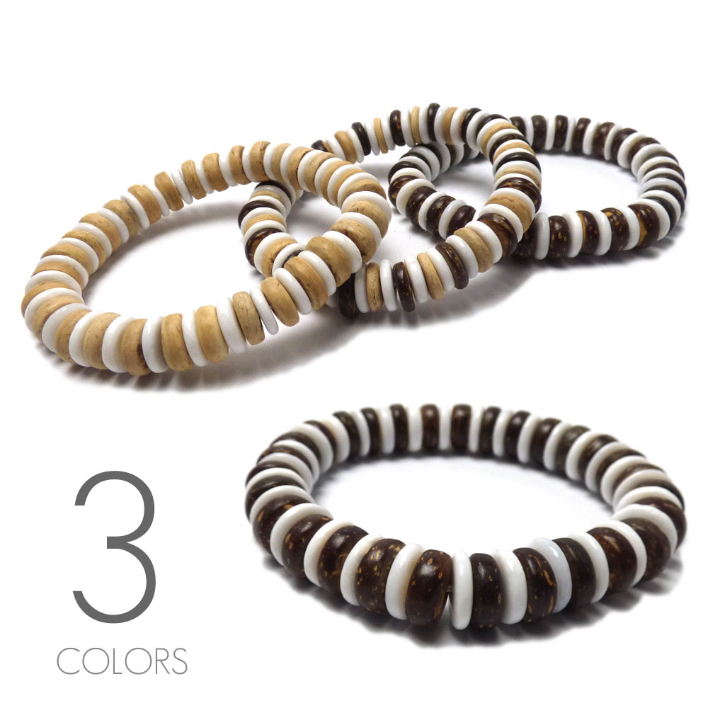 10mm ハワイアンココウッド(ココヤシ)&ホワイトシェル ブレスレット/ ゴムブレス 【メンズ/レディース】