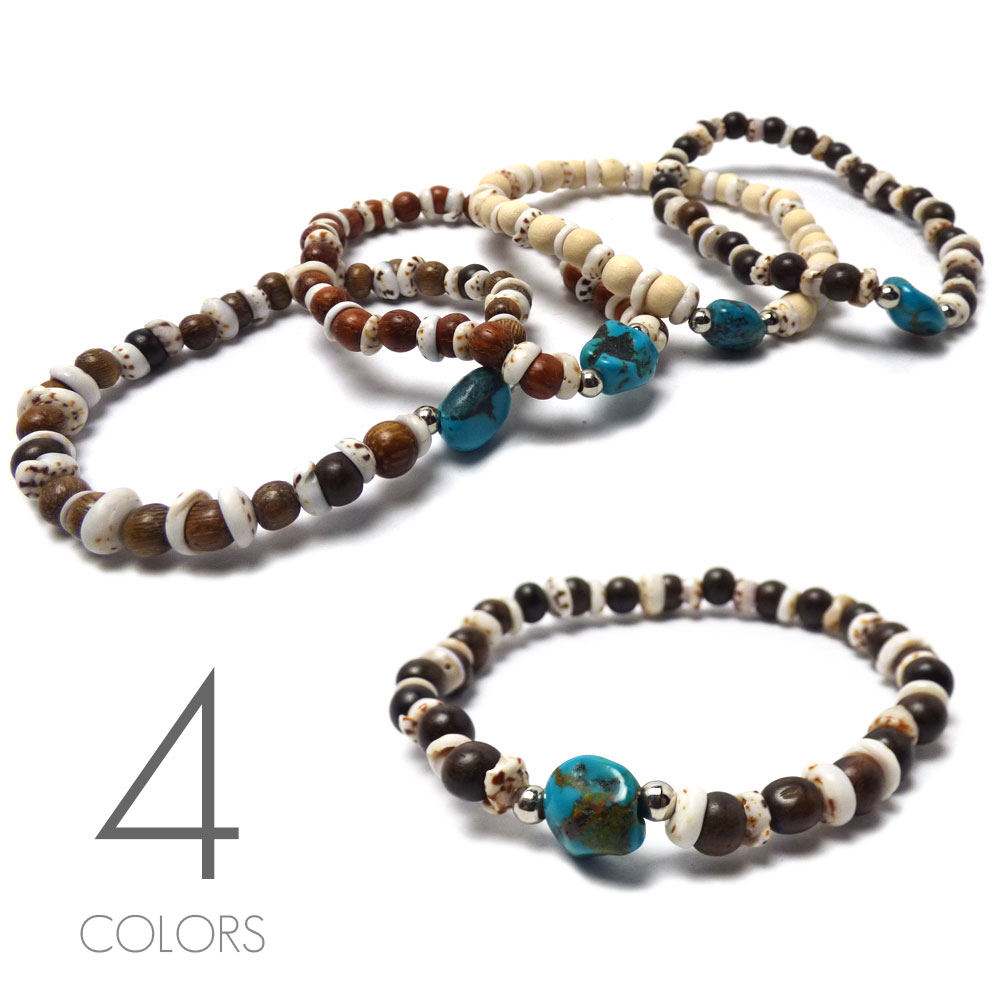ハワイアンコアウッド&タイガープカシェル 天然石ターコイズ ブレスレット/ ゴムブレス 【メンズ/レディース】