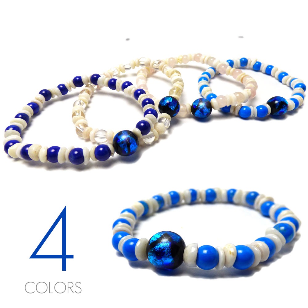 10mm琉球ホタル玉(蛍石入りホタルグラス仕様) ホワイトシェル(プカシェル) 天然石 ブレスレット 【メンズ/レディース】